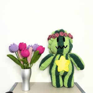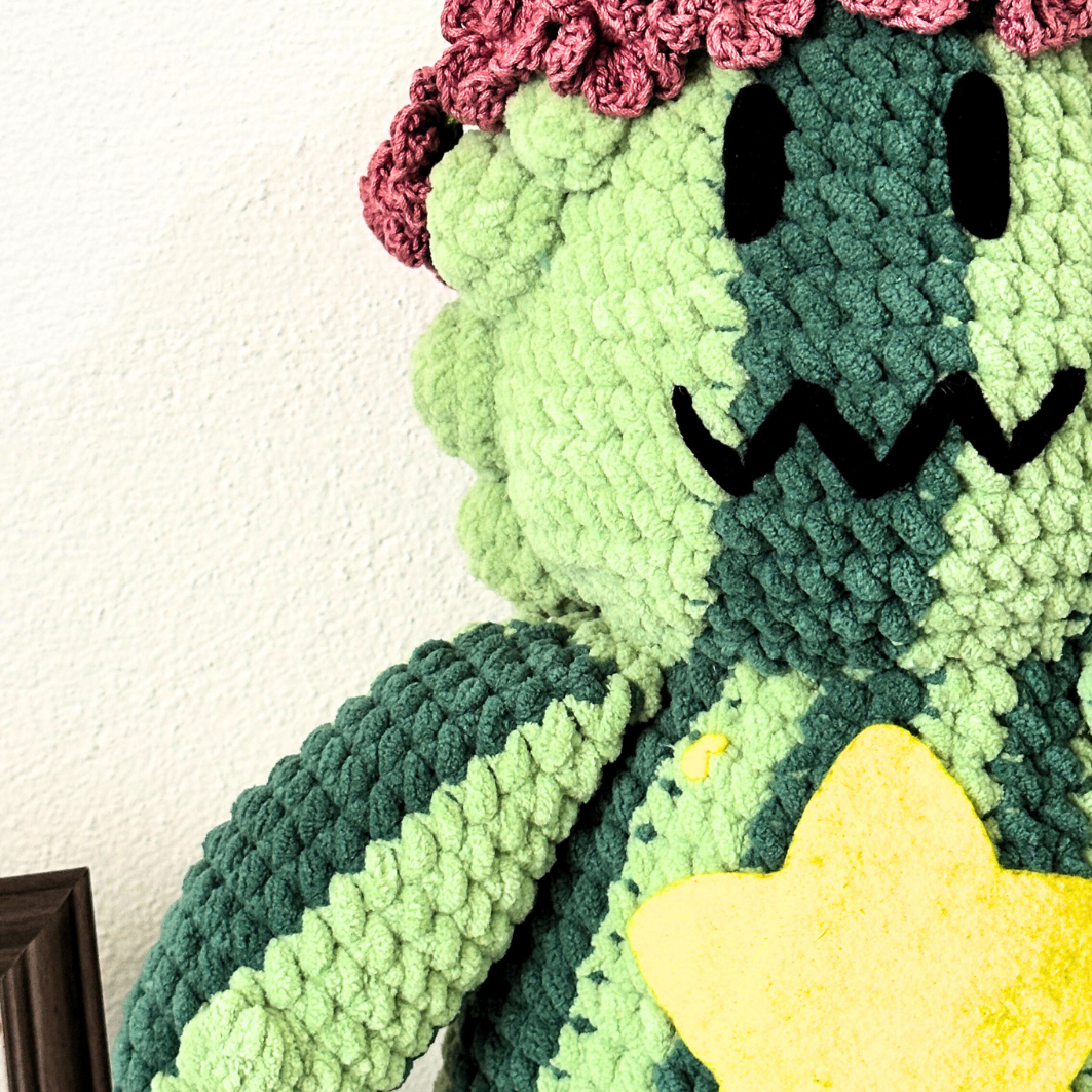 Steven Sandía es una pieza artesanal tejida a crochet que combina textura suave, volumen y detalles cuidadosamente elaborados. Está confeccionado con estambre chenille de poliéster, un material conocido por su tacto aterciopelado y apariencia acolchonada.
