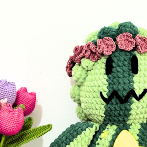 Su estructura se complementa con relleno acrílico de alta densidad, permitiendo que el amigurumi conserve su forma y volumen. Los detalles en fieltro y la diadema de flores tejidas con algodón mercerizado aportan contraste visual y un acabado delicado que realza el carácter artesanal de la pieza.