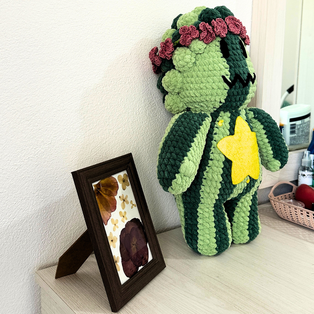 Steven Sandía es un amigurumi decorativo tejido a crochet con estambre chenille de poliéster, relleno acrílico y detalles en fieltro. Su diseño suave y voluminoso lo convierte en una pieza artesanal ideal para decoración o colección.